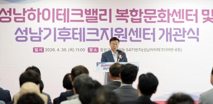 (비전21뉴스) 성남시가 산업단지 내 공공지원 기능을 강화하고 근로자 복지 증진과 기후테크 산업 육성을 위해 조성한 ‘성남하이테크밸리 복합문화센터’와 ‘성남 기후테크지원센터’가 4월 30일 오전 11시 개관식을 열고 본격적인 운영에 들어갔다.