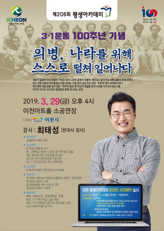 이번 평생아카데미는 2019년 첫 번째 아카데미 강연으로, 대한민국 임시정부 수립과 3·1운동 100주년을 기념해 ‘의병, 나라를 위해 스스로 떨쳐 일어나다’를 주제로 일제강점기 나라를 구하기 위해 전개된 이름 없는 민초들의 항일 의병 이야기를 얼마 전 인기리에 종영한 드라마 ‘미스터 션샤인’의 명장면과 함께 만나보는 유익한 시간을 가질 예정이다.
