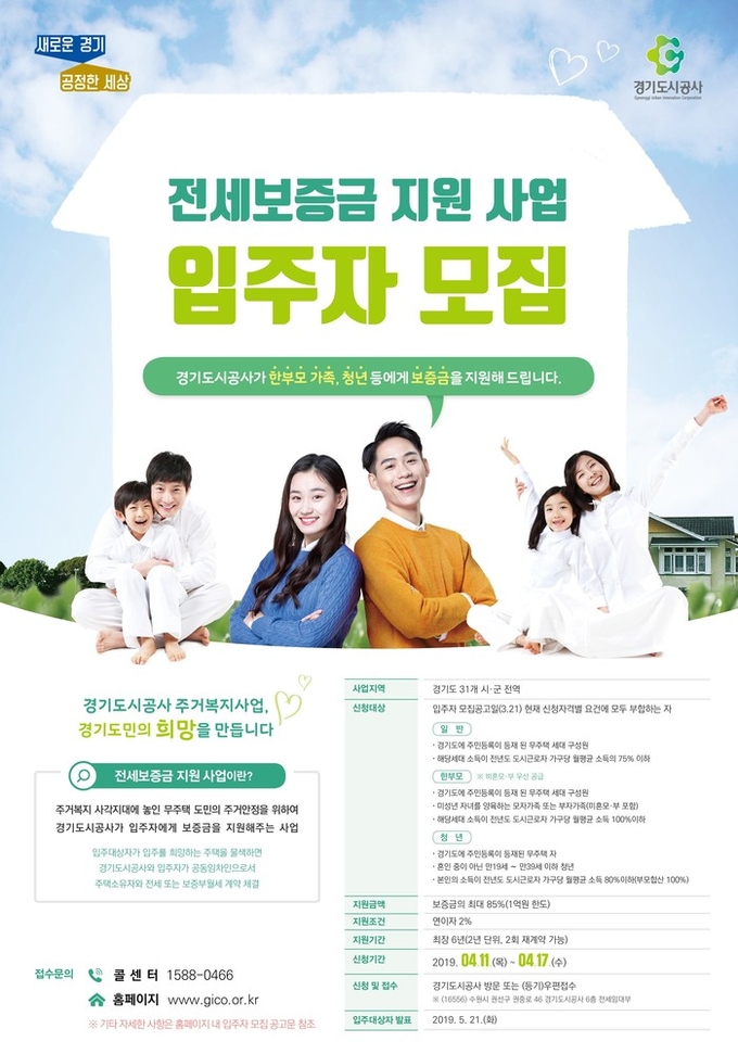 경기도시공사(사장 이헌욱)는 21일 경기도내 무주택 저소득층의 주거안정을 위한 ‘전세보증금 지원사업’ 입주자 50가구를 모집한다고 밝혔다.