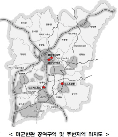 [비전21뉴스] 파주시는 미군반환공여지 4곳에 대해 사업자 공모를 통해 사업제안 및 민간투자를 유치할 예정이다. 사업대상지는 월롱면 영태리 캠프 에드워즈, 문산읍 선유리 캠프 자이언트와 캠프 개리오언, 광탄면 신산리 캠프 스탠턴이다.