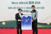 (비전21뉴스) 김포시는 17일 솔터실내테니스장에서 대한민국 테니스 스타 정현 선수의 김포시청 직장운동경기부 테니스팀 입단을 기념하고, 데이비스컵 2라운드 진출을 축하하는 행사를 개최했다. 이날 행사에는 김병수 김포시장을 비롯해 임청수 김포시체육회장, 박헌규 김포시테니스협회장과 테니스 관계자 및 동호인 등이 참석해 자리를 빛냈다. 행사는 시민과 동호인을 대상으로 한 팬 사인회를 시작으로 정현 선수의 주요 활약상을 담은 영상 상영, 기념 퍼포먼스, 입단 소감 및 축사 순으로 진행됐다. 특히 이날 행사에서는 정현 선수가 최근 데이비스컵 경기에서 실제 착용한 유니폼을 기념 액자로 제작해 김병수 시장에게 전달하는 의미 있는 시간이 마련됐다. 해당 유니폼은 국가대표 경기 특성상 소속팀 마크를 부착할 수 없음에도 불구하고, 정현 선수가 김포시청 입단을 기념하고 김포시를 알리기 위해 대한테니스협회에 요청해 특별히 김포시청 마크를 부착하고 출전한 것으로 알려져 의미를 더했다. 이어 김병수 시장은 정현 선수에게 꽃다발을 전달하고, 정현 선수의 유니폼에 김포시청 마크를 부착하는 퍼포먼스를 통해 김포시청 선수로서의 새