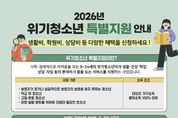 (비전21뉴스) 동두천시는 2026년 ‘위기청소년 특별지원’과 관련해 사회·경제적으로 어려움을 겪는 관내 위기청소년들에게 다양한 혜택을 제공하기 위한 신청을 3월 30(월)까지 받는다고 밝혔다. 지원 대상자는 9세 이상 24세 이하의 위기청소년(은둔청소년, 저소득 한부모 가족 자녀 등)으로 생활, 건강, 학업, 자립, 상담, 법률 지원 등 다양한 혜택을 받을 수 있다. 신청은 청소년 본인, 보호자, 청소년지도자, 교원, 사회복지사, 청소년 담당 공무원 등이 청소년이 거주하고 있는 행정복지센터에서 할 수 있다. 선정 기준은 소득 기준 중위소득 100% 이하이며, 지자체 ‘청소년복지심의위원회의’ 심의를 통해 적합 대상자 및 지원 금액, 기간 등이 결정된다. 시 관계자는 “모든 위기 청소년들에게 도움이 됐으면 좋겠지만, '국민기초생활 보장법','긴급복지지원법','의료급여법','사회복지사업법' 등에 따라 이미 지원을 받고 있는 경우 동일 내용의 중복 지원은 불가하다”라고 말했다.
