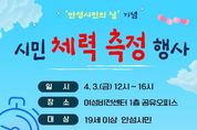 (비전21뉴스) 안성시보건소는 ‘안성 시민의 날’을 맞아 시민의 건강 증진과 올바른 생활 습관 형성을 돕기 위한 ‘시민 체력 측정 행사’를 개최한다고 밝혔다. 이번 행사는 오는 4월 3일 오후 12시부터 4시까지 안성시 여성비전센터 1층 공유오피스에서 진행된다. 현장에서는 체력 측정뿐만 아니라 심뇌혈관 질환 예방, 신체활동, 금연, 구강 관리 등 건강 인식 향상을 위한 다양한 건강증진 부스도 함께 운영될 예정이다. 체력 측정은 1인당 약 30분이 소요되며, 원활한 운영을 위해 오는 3월 27일까지 선착순 80명을 대상으로 사전 접수를 받는다. 신청은 홍보물에 포함된 QR코드 또는 온라인 설문 링크를 통해 할 수 있다. 당일 현장 접수도 가능하지만, 대기 시간이 발생할 수 있어 사전 예약이 권장된다. 상세 측정 절차는 ▲혈압 체크 ▲체격 검사(신장, 체중, 체성분 분석) ▲근력 측정 ▲심폐지구력(65세 이상은 협응력) 측정 순이며, 측정 후에는 결과지 제공과 함께 1:1 맞춤형 상담이 이뤄진다. 단, 안전을 위해 행사 당일 혈압이 고혈압 기준(수축기 160mmHg 또는 이완기 100mmHg 이상)을 초과할 경우