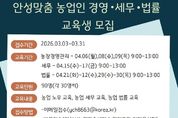 (비전21뉴스) 안성시농업기술센터가 지역 농업인의 안정적인 영농 활동을 돕기 위해 오는 31일까지 ‘안성맞춤 농업인 경영·세무·법률 교육’ 교육생을 모집한다. 이번 교육은 전문가 특강을 통해 농가 운영 중 발생할 수 있는 경영적, 법적 문제를 사전에 예방하고 해결할 수 있는 역량을 키워주기 위해 마련됐다. 교육은 오는 4월 6일부터 30일까지 주제별 지정된 날짜에 진행된다. 모집 분야는 ▲농업 경영 ▲농업 세무 ▲농업 법률 등 3개 과정이며, 분야별로 30명씩 총 90명을 선발한다. 신청 인원이 초과할 경우 내부 선발 기준에 따라 교육생을 최종 선정할 예정이다. 신청 자격은 농업 경영에 관심 있는 안성시민이라면 누구나 가능하며, 접수는 3월 31일까지다. 참여를 희망하는 시민은 이메일을 보내거나 농업기술센터 농업지도과(보개원삼로 219)를 방문해 신청하면 된다. 시 관계자는 “농업인의 눈높이에 맞춘 경영·법률·세무 전문가 특강이 농가 역량을 강화하는 좋은 기회가 될 것”이라며, “안성 농업의 내실을 다지고 싶은 시민 여러분의 많은 관심과 참여를 바란다”고 말했다.