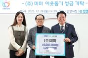 (비전21뉴스) 안양시는 지난 29일 ㈜미미로부터 이웃돕기 성금 1천만원을 기탁받았다고 30일 밝혔다. 이날 시청 접견실에서 열린 성금 전달식에는 최대호 안양시장과 조인주 ㈜미미 회장, 조예서 전무 등이 참석했다. ㈜미미는 만안구 덕천로에 소재한 기업으로 용역·청소·경비·주택업·건물종합관리 등 다양한 분야에서 사업을 운영하고 있으며, 지역사회 나눔과 사회공헌 활동에도 꾸준히 동참하고 있다. 이번에 기탁된 성금은 안양시 이웃돕기 성금으로 사용되며, 저소득층 건강보험료 지원과 취약계층 물품 지원 등 관내 어려운 이웃을 돕는 데 활용될 예정이다. 조인주 회장은 “지역사회로부터 받은 사랑을 다시 이웃과 나누고자 성금을 기탁하게 됐다”며 “작은 정성이지만 어려운 분들께 도움이 되기를 바란다”고 전했다. 최대호 안양시장은 “연말을 맞아 따뜻한 나눔을 실천해 주셔서 감사드린다”면서 “성금은 저소득층과 취약계층 등 도움이 절실한 이웃들에게 투명하고 공정하게 전달하겠다”고 말했다.